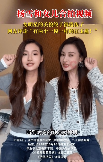 11月4日,演员杨雪在社交平台分享了一段与女儿的温馨同框视频。画面中母女二人容貌极为相似,宛若姐妹,引发网友热议。不少观众幽默评论道:“这简直是两个一模一样的江玉燕!”