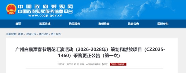 与此同时,官方采购网站在近日也同步挂出了“白鹅潭春节烟花汇演活动(2026—2028年)”项目更正公告: