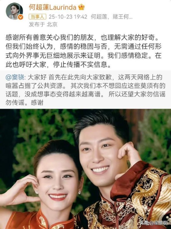 2025年10月23日,两人通过微博发布联合声明,强调“感情稳定”,呼吁停止传播不实信息,但未具体回应经济矛盾或法律登记状态。11月偶遇事件后,网友普遍认为此举是对传言的实质破除。