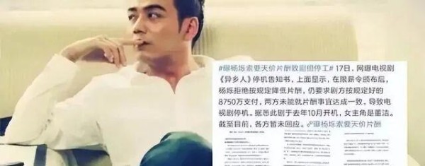 如果说绯闻只是伤了口碑,那顶风贪薪就是直接触碰了行业红线。2018 年广电总局刚下发限薪令,明确规定演员单集片酬不能超过总成本的 40%,最高不超过 5000 万,央视更是多次强调 “行业自律” 的重要性。可杨烁偏要 “顶风作案”,他在《异乡人》剧组已经签好 8750 万片酬的合同,限薪令出台后,剧组找他协商降薪,他不仅坚决不松口,还直接罢演导致剧组停拍。