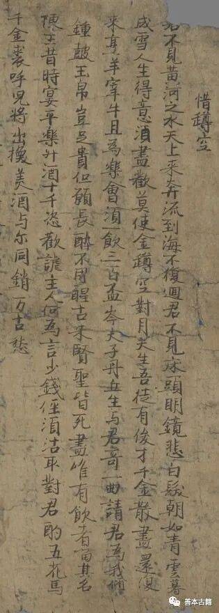 据徐俊《敦煌诗集残卷辑考》,《将进酒》这首诗的文字分别见于三种敦煌卷子写本:伯2567、斯2049、伯2544。这些写本的书写者应该是当地人。其中伯2567字迹工整,字句完整,而且有诗题《惜罇空》(见图),是敦煌写本的代表,书写者应具有较高文化水平。1913年,罗振玉编的《鸣沙石室佚书》收入了18种敦煌卷子影印件,载有《惜罇空》的伯2567就在其中。1958年中华书局上海编辑所编《唐人选唐诗(十种)》,据《鸣沙石室佚书》录为《唐写本唐人选唐诗》,也载有《惜罇空》,原诗如下: