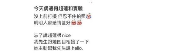 偶遇何超莲夫妇的网友称,夫妻俩感情很好,自己在旁边偶遇都没好意思上前打扰,此外路人还表示何超莲也很亲切,与自己先生四目相接之后,还主动打招呼。不过即便是这么被偶遇了,还是有人觉得何超莲与窦骁之间的感情有问题,认为这是刻意表现出来。明明这也不是何超莲主动发出来秀恩爱的,是路人不经意偶遇抓拍的,并且还不只是一个路人偶遇到了——在澳洲期间,不少人都遇见了夫妻俩,并且都表示两人很恩爱,如果这个都觉得有问题,那还真是无话可说了。