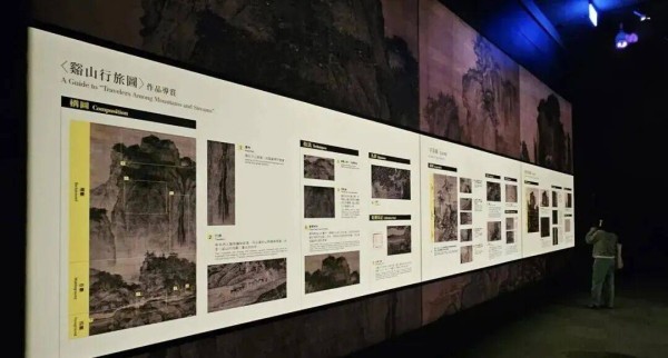 《溪山行旅图》是传世三件北宋山水巨作中的一件,约绘制于1000年。画者在前、中、远三段式的构图中,藉着拉近中景、推远主山的手法,巧妙地突显行旅队伍的渺小与巍峨崇高的主山,让人产生一种如临其境的壮硕之感。