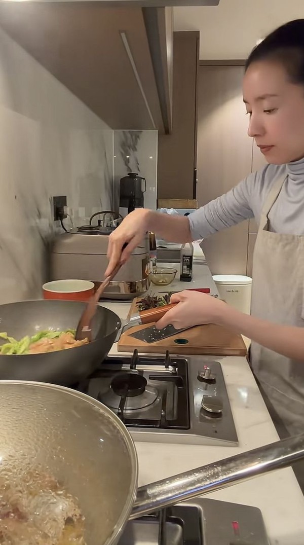 虽在北京住着宽敞豪宅,但董洁家并未通暖气,11 月的天气里,仅靠空调取暖难以达到理想温度,因此她常穿着高领内搭加运动外套抵御微凉。不过豪宅的厨房倒是十分亮眼 —— 长长的操作台收拾得干净整齐,餐具与调味品虽大多摆在台面上,却不显杂乱;更让人惊喜的是双炉灶设计,让她能一边炒菜、一边炖牛肉,大大提升了做饭效率。