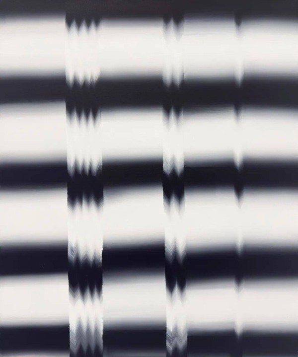 A 其实我从2010年已经开始进入到一个色彩简化与纯化的过程了。黑白色中尽管也有情绪的表达,但颜色对视觉的挑逗性容易让人忽略和干扰作品背后你想真正要表达的东西。“结构·波”所形成的流动的视觉效果,是我绘画中很重要的一个部分,我有意识地去强调的一种新的视觉挑战:你只有在离我的绘画距离很近的时候,才会感受到从笔触里透出的绘画的呼吸和力量;反之当和画面保持一定的距离的时候,我不会让你的眼睛落在画面的具体的某一个点上,你必须放弃对细节的关注,因为你无法关注细节,所有的细节都被模糊的流动的状态所包容,能和作品对流的感知力来自整个画面传递的信息与内在的感受成为一个不可分割的整体。