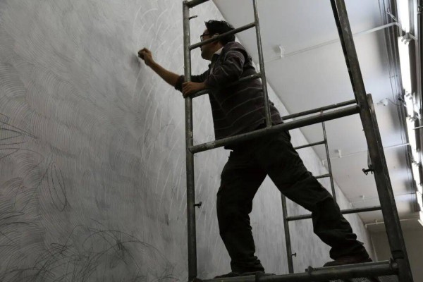 A 2015年我在元典美术馆的展览《中华HB》,是另外一种“行动绘画”,美术馆的整个空间是我的试验场。我尝试把自己的整个身体作为媒介,当每天走入美术馆,开灯把空间激活,再爬上爬下脚手架,用无数的铅笔在巨大的墙面上任意地涂抹,到了晚上,再关灯离场,回到自己的工作室。这里面也有一种链接,它是一个生命体穿梭于不同的场域的连接,也是把不同时间的生命体验关联起来的修正的过程。