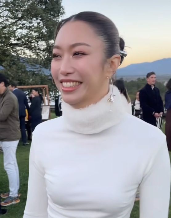 仪式结束后,户外酒会紧接着开启。午后的丽江气温渐凉,Namfon换上一条白色贴身长裙,领口和袖口的毛茸茸装饰既保暖又增添了几分可爱。她穿梭在宾客之间,与前来道贺的泰国好友热情寒暄,时而举杯畅饮,时而低头浅笑,完全没有豪门儿媳的拘谨。霍启仁则始终陪伴在妻子身边,不时为她整理裙摆、递上饮品,两人互动间的默契藏都藏不住。