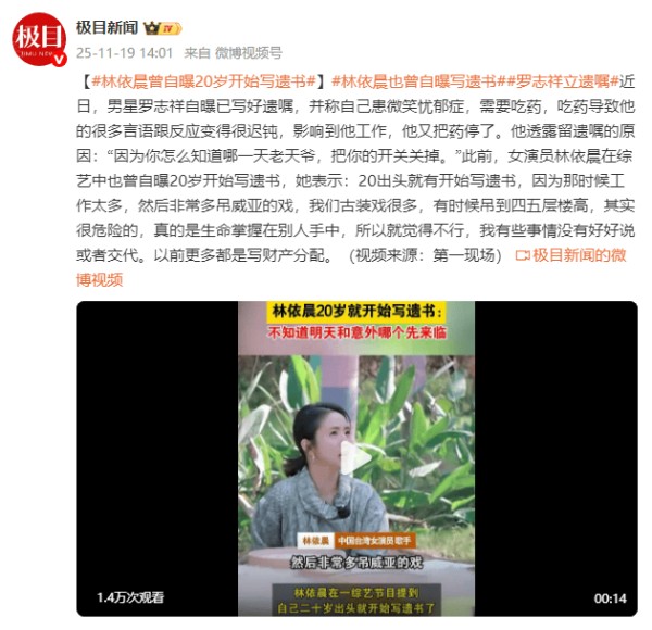 此前,女演员林依晨在综艺中也曾自曝20岁开始写遗书,她表示:“20出头就有开始写遗书,因为那时候工作太多,然后非常多吊威亚的戏,我们古装戏很多,有时候吊到四五层楼高,其实很危险的,真的是生命掌握在别人手中,所以就觉得不行,我有些事情没有好好说或者交代。以前更多都是写财产分配。”