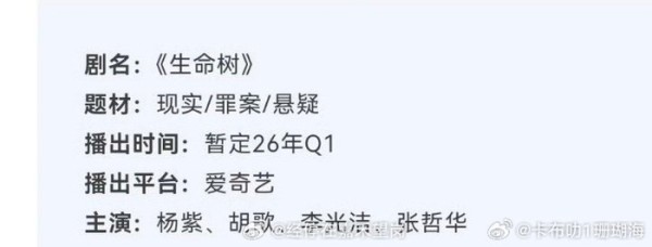 杨紫一番主演的《生命树》播前招商了,暂定2026开年播出。