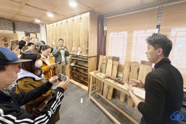 采访团一行走进古文化街,在“乐器张”里数十张古琴、古筝、琵琶错落有致地陈列着,每件乐器都散发着温润的光泽。游客们不仅可以驻足聆听,更可以亲手拨动琴弦,感受从指尖传至心尖的奇妙瞬间。在“泥人张世家美术馆”,采访团成员上手体验制作技艺,长长的木案前,专业老师的指导着大家雕琢着手中的泥团,感受着传统艺术的无限魅力。在“津港印象”展馆展厅内,成员们置身负一层的5D动感影院中,漕运帆影与集装箱巨轮交叠驶过,历史的风浪与时代的潮音在身侧共振。
