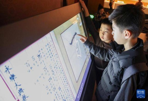 11月22日,参观者在国家典籍博物馆的互动区学写永乐大典中的字体。