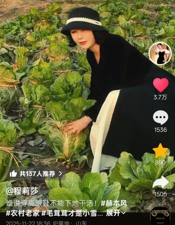 程莉莎回到老家,还特意拍了一条诙谐的短视频,她身穿一套奥黛丽赫本风格套裙,脚踩高跟鞋,到老家菜地刨白菜。村里寻常可见的大白菜,被如此装扮的程莉莎揽在手里,配上优雅的动作,逼格瞬间提升。郭晓东和兄弟郭晓峰早已在北京安了家,郭父去世得早,如今70多岁的郭母一人独自在村里住。