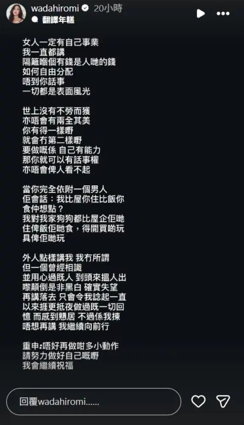 裕美昨天没有现身记者会,但事后在社交平台发文回应事件。她说:“女人一定要有自己的事业。我一直都说,隔壁那个有钱是别人的钱,如何自由分配,轮不到你做主,一切都是表面风光。世上没有不劳而获,也不会有两全其美。你得到一样东西,就会失去另一样东西。