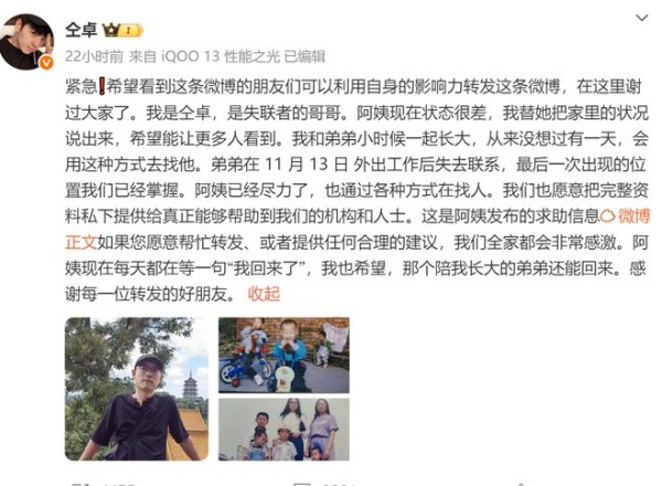 随后,李怡亨的母亲报警,并在微博发布了求助信息,亲友仝卓也发文,希望能让更多人看到失联者信息,由此发酵引发了外界很大关注。