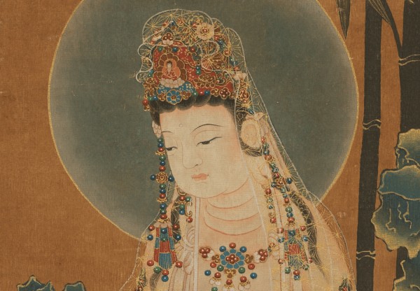 这种既具装饰效果又富含哲理象征的构图,使高丽水月观音成为整个东亚绘画史上极为突出的图像母题。其艺术魅力一方面源于唐宋绘画精神的延续与再创造,另一方面也来自高丽时代的宫廷审美与佛教信仰的深度融合。高丽工匠成熟的设色体系,用金泥、石青、石绿与富丽的矿物颜料打造出精致典雅的视觉效果,使水月观音成为兼具宗教境界与世俗审美的“跨文化艺术作品”。