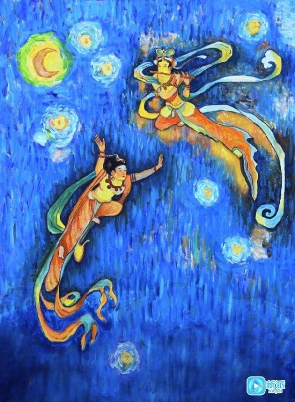 《友谊使者》作品延续了刘铁飞为2022北京冬奥创作的《踏雪飞天》风格,画面中两位飞天女子腾跃而起,在星月夜空中飞舞,上面的飞天正在演奏,下面的飞天双臂向上迎合,美妙的乐曲响彻星空,宇宙中一片和谐。作品是对人类永恒追求的赞美,表达了友谊、和平的理念。