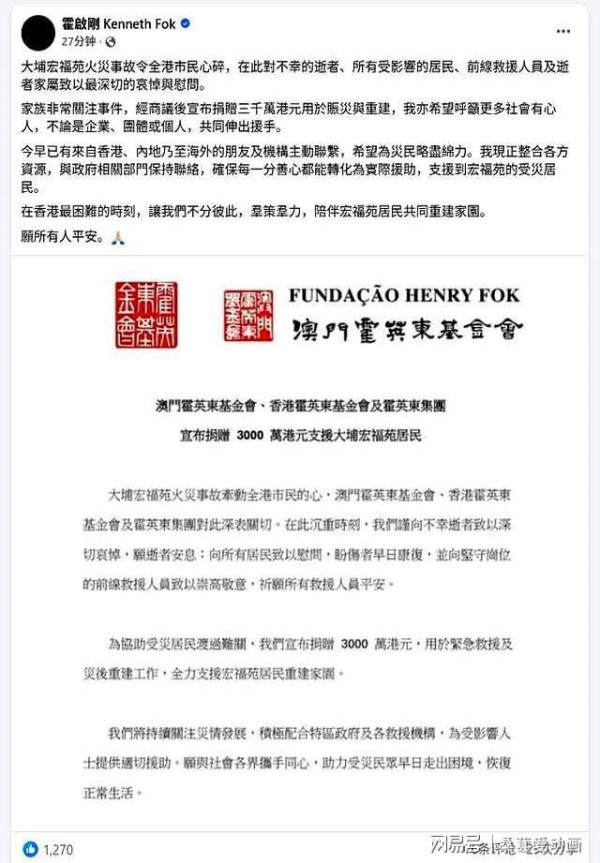 在捐款之后,霍启刚并没有选择退回隐秘的生活,而是选择与公众分享他的心声。