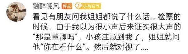 网友认出董卿的过程也有些好笑,检票的时候她就认出了董卿,用一种她自认为很小声但是别人都听到的声音询问“这是董卿吗”,引得董卿的孩子都和她对视了,而董卿看到孩子转过身询问孩子你在看什么,于是乎博主就和董卿对视了。