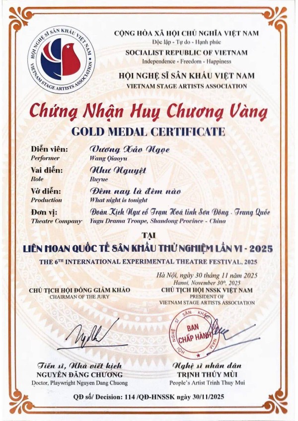 2025年第六届国际实验戏剧节于11月20日至30日在越南宁平举办,来自十多个国家的29个剧种剧目入围最终决赛圈,最终评选出特等奖两个、一等奖8个。沾化渔鼓戏《今夕何夕》因去年在东盟国际戏剧周的惊艳亮相,成为本届戏剧节决赛阶段公认的种子剧目,最终凭借高艺术水准、高观众口碑,赢得国际评委团和现场观众的一致称赞,斩获最高奖,成为最大赢家。