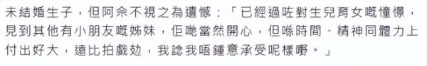 50岁的佘诗曼不婚不育,她说现在已经过了生儿育女的憧憬,见到小朋友很开心,但时间和体力都付出很大,比拍戏还累,可能自己不喜欢承受这件事,目前已经放下一半工作,抽时间陪伴家人,对不婚不育这件事,并不遗憾。