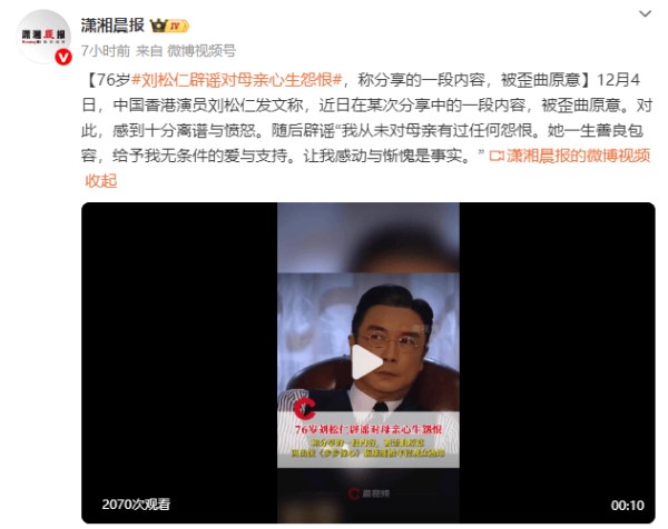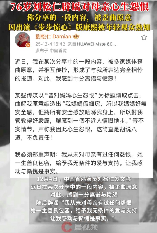 12 月 4 日,港星刘松仁发文称分享内容被曲解,对此感到离谱又愤怒,并针对相关传言进行辟谣:“我从未对母亲有过任何怨恨。她一生善良包容,给予我无条件的爱与支持。让我感动与惭愧是事实。”