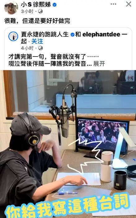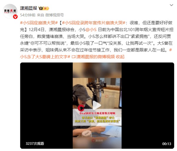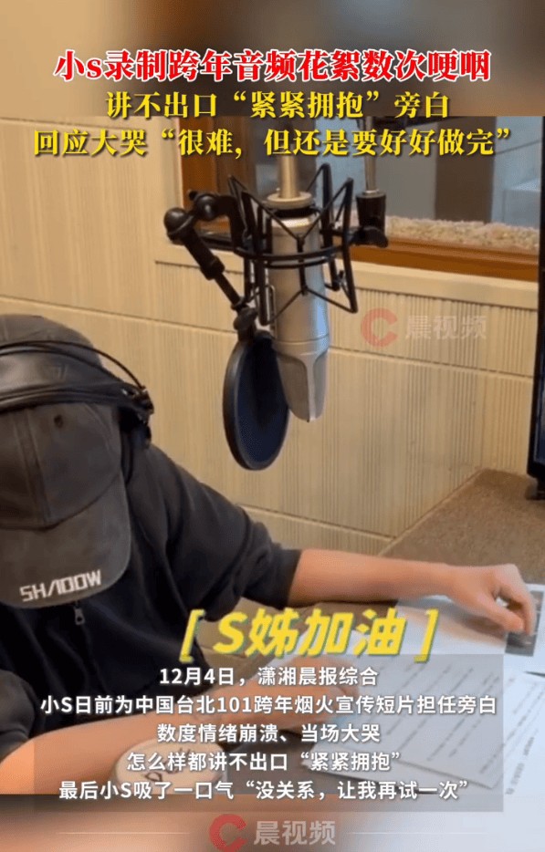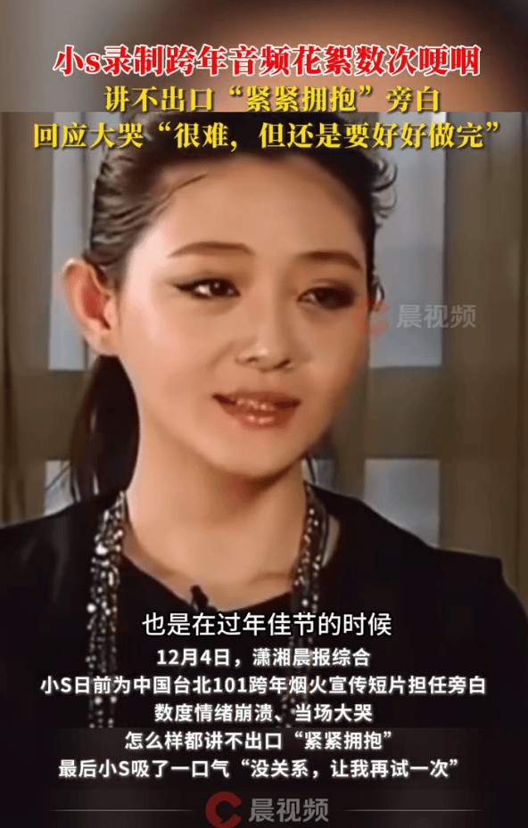12月4日,小S在社交平台上发文回应录制跨年宣传片大哭,她表示:“很难,但还是要好好做完。”