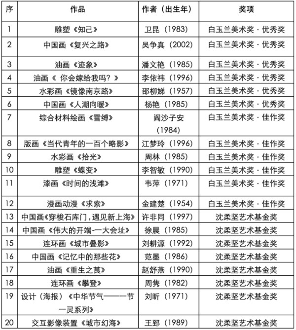 荣获本届“白玉兰美术奖”和“沈柔坚艺术基金奖”的20位作者中,年龄最小的23岁,年龄最长的72岁,“85后”“90后”已成为创作的中坚力量。