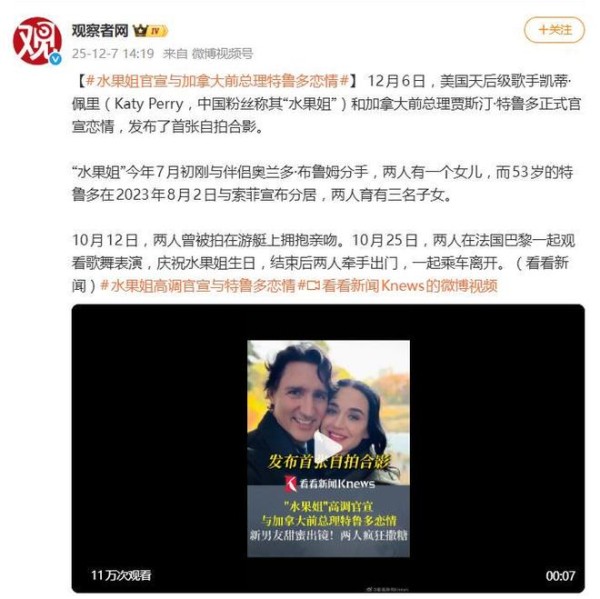 12月6日,美国流行天后“水果姐”凯蒂·佩里在社交媒体上扔出一颗重磅炸弹:她与加拿大前总理贾斯汀·特鲁多正式官宣恋情,并发布了首张在日本街头的亲密自拍合影。这张照片瞬间引爆全球网络,让无数网友惊掉下巴——这跨界组合,简直比任何一首新单曲都来得轰动。