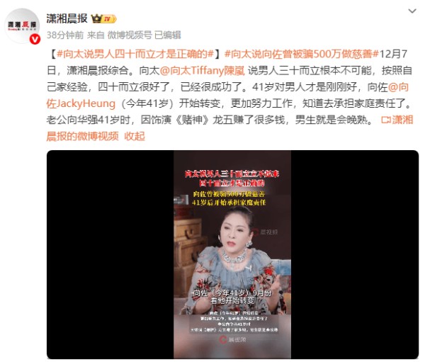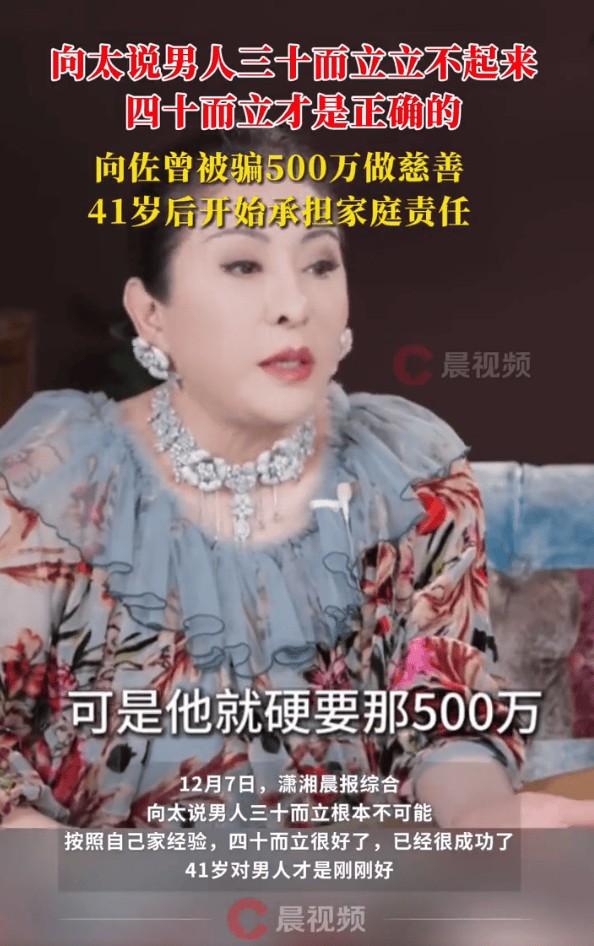 向太近日公开反驳“三十而立”的说法,她直言男性三十岁根本达不到“而立”的状态。结合自家的经历,她认为男人四十能立业就已十分成功,41岁才是刚刚好的年纪。她举例称,儿子向佐今年41岁,近期开始明显转变,不仅工作更努力,也懂得扛起家庭责任;而丈夫向华强当年也是在41岁时,凭借《赌神》里的龙五一角收获高人气并赚到不少收入。
