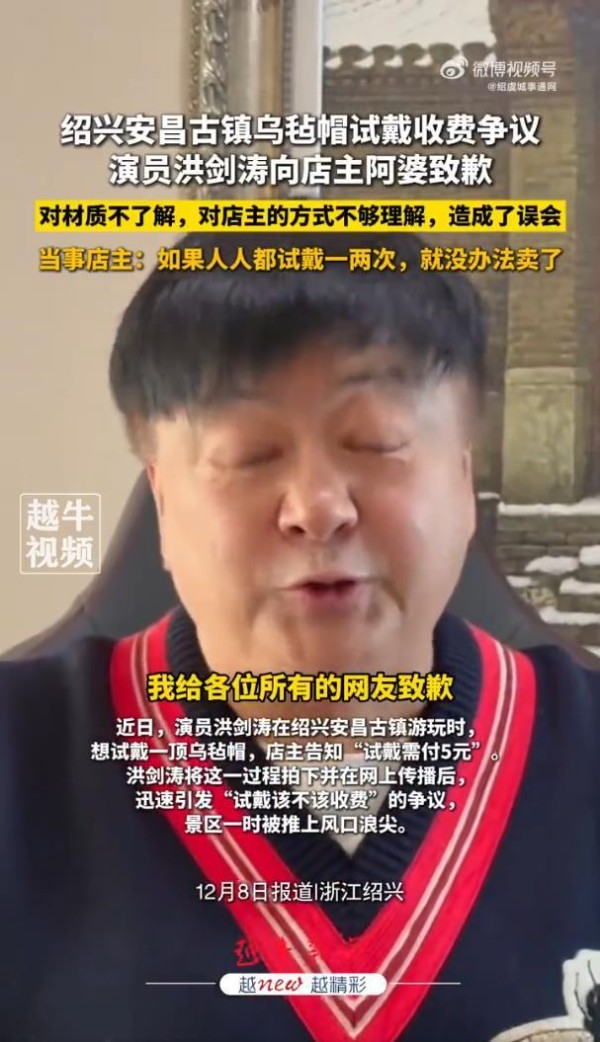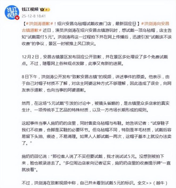 时隔6天,洪剑涛于12月8日发布了道歉视频。他承认自己此前确实不了解乌毡帽的材质特性和易损性,对店主的方式“不够理解造成误会”,并向施奶奶和网友致歉。他也解释称当时未注意到收费标识,但强调“并非故意遮挡”,呼吁公众不要过度解读。