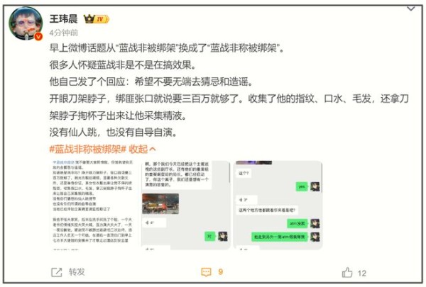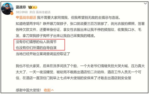 另外,蓝战非还回应了大家很关心的金额问题。称对方张口就要300万,但很显然遇到了阻碍。毕竟互联网这么发达,绑匪完全可以用蓝战非的手机直接转账,但蓝战非却被带到了外面的atm机取钱,可见无法在蓝战非手机上取到300万。
