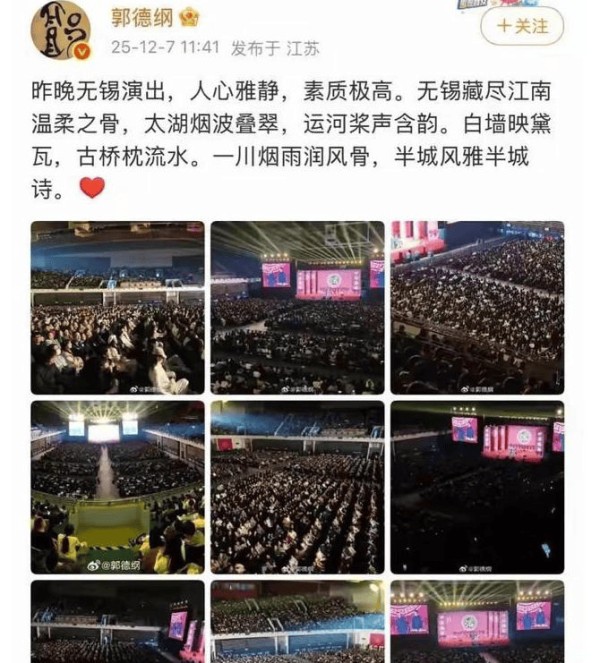 其实在6号的时候,德云社在无锡的演出结束以后,郭老师在社交媒体发了一句“人心静雅,素质极高”。