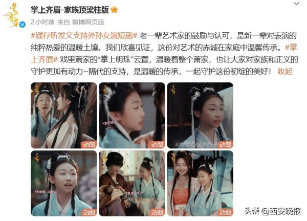 12月9日,剧方发文回应:“老一辈艺术家的鼓励与认可,是新一辈对表演的纯粹热爱的温暖土壤。我们欣喜见证,这份对艺术的赤诚在家庭中温馨传承。戏里萧家的‘掌上明珠’云萱,温暖着整个萧家,也让大家对家族和正义的守护更加有动力~隔代的支持,是温暖的传承,一起守护这份初绽的美好!”