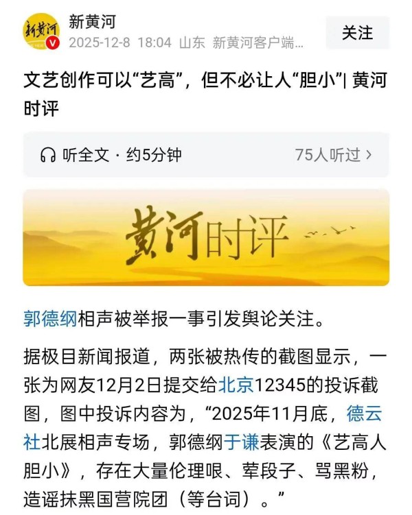12月8日,新黄河针对郭德纲事件发表了一篇文章,名为:文艺创作可以“艺高”,但不必让人“胆小”!