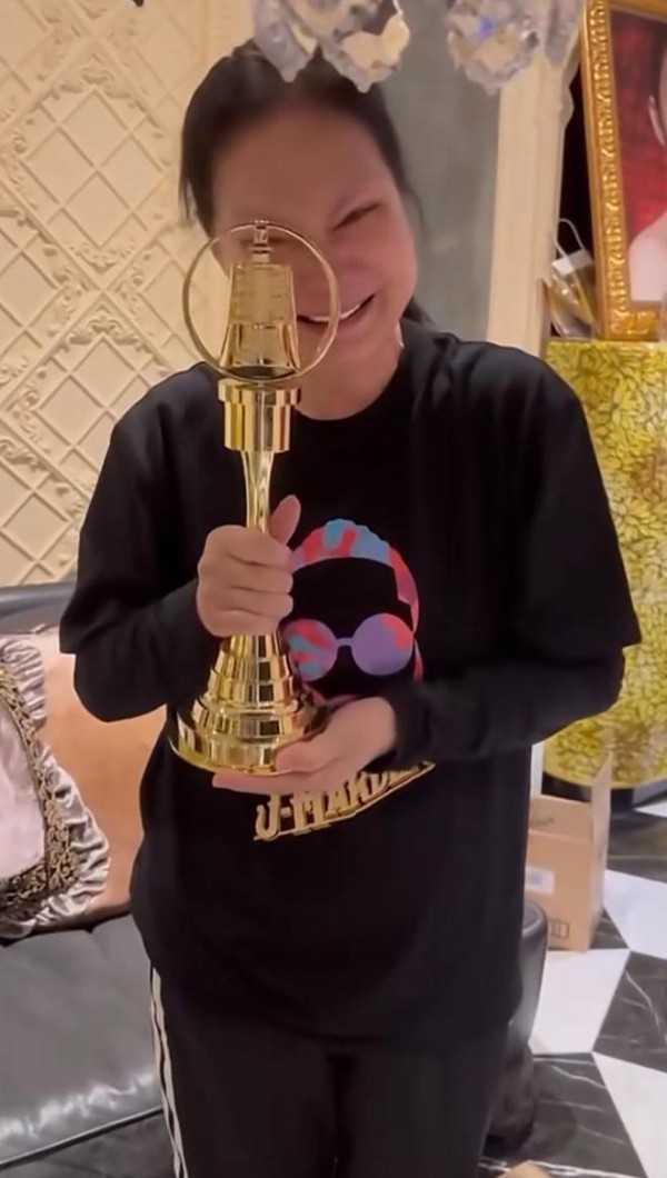 小S把奖杯送给S妈,晒奖杯与全家福合照,S妈手捧奖杯眼含热泪