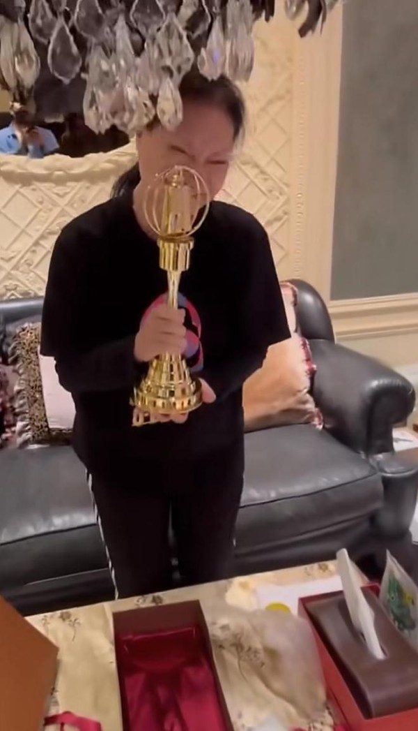 为S妈录制视频的是一位工作人员,她把S妈从拆开奖杯到拿起来都通通录制下来,S妈小心翼翼地打开盒子,如获至宝一样轻轻拿起,一举一动都透露出对奖杯的尊重。