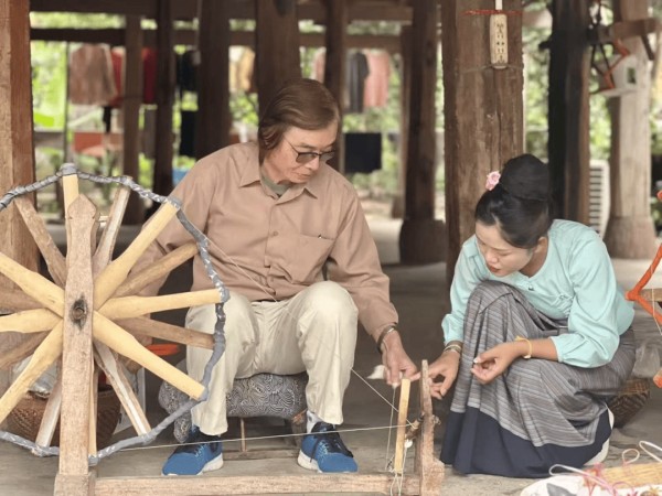 随后,王松老师沉浸式体验了傣族传统民俗技艺。在非遗传承人的指导下,他亲手操作纺车体验傣族纺线技艺,感受棉线在指尖缠绕成型的传统工艺魅力,详细了解傣锦原料加工、纹样设计的文化寓意。