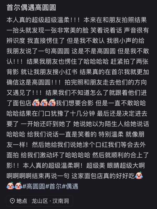 不过网友第一时间并不敢确认,毕竟偶遇明星非常不容易,于是她便拍照在某社交平台中搜索,发现高圆圆当下确实就在韩国首尔,于是她与好友便上前与高圆圆攀谈。