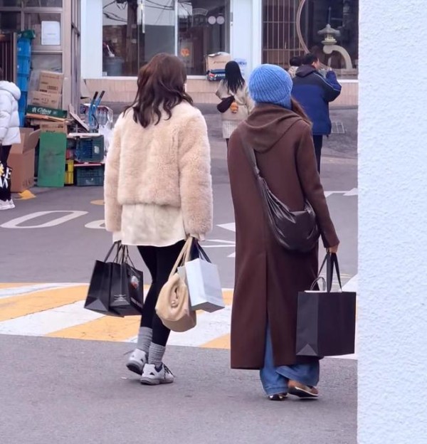与高圆圆聊天合影后,网友还跟拍高圆圆了一段路程,由此可知,高圆圆当天与好友在首尔逛街购物,两人提着大包小包的物品,收获满满。