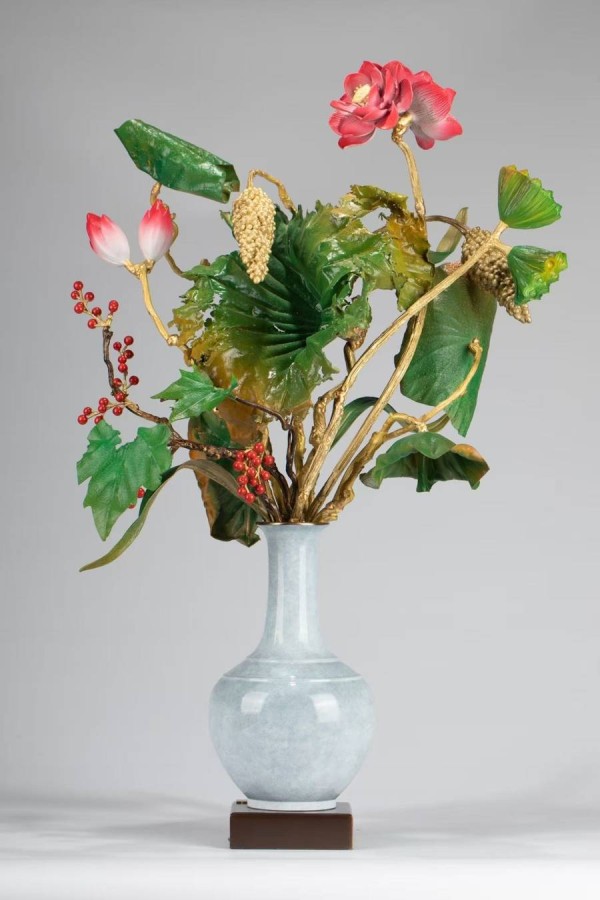 朱炳仁之子、国家级非物质文化遗产项目铜雕技艺代表性传承人朱军岷,作为铜雕技艺的新一代传承人,将传统技艺与现代科技结合,在“熔铜”艺术基础上进一步创新了熔铜禅画、熔铜清供、琅彩铜画等艺术表现形式。他此次捐赠的《连年如意》《繁花似锦》《蕉石鹤寿》《万全如意》四件作品,均以中国古代传统吉祥题材展开创作,在材质、造型、颜色处理方面匠心独运,实现了古典意蕴与当代审美的交融。