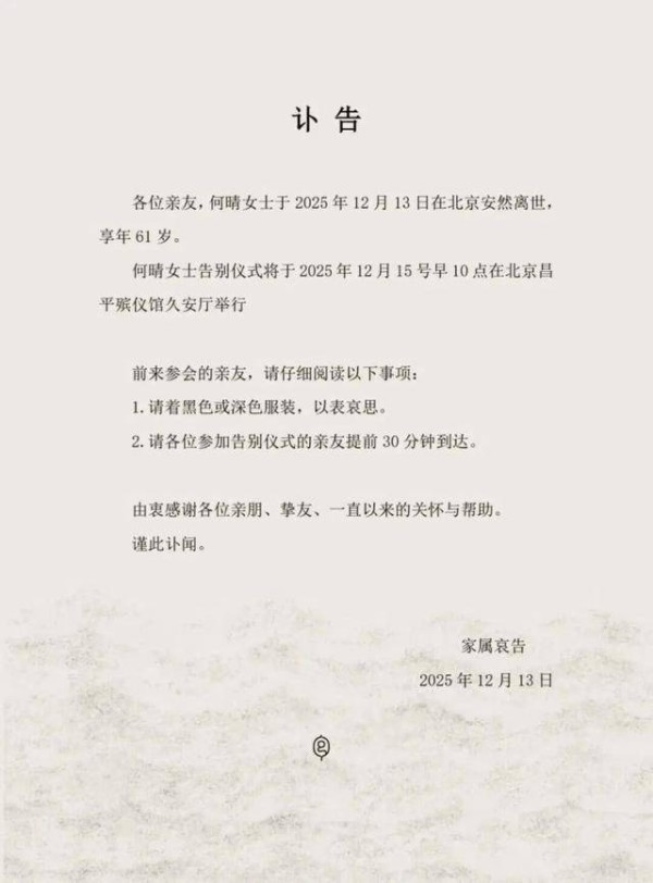 12月13日,著名演员何晴的家属发出讣告,告知亲友,何晴已于13日在北京安然离世,享年61岁。
