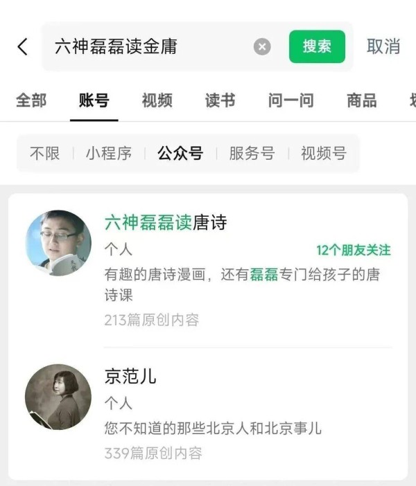14日下午,记者注意到,未关注该账号者已无法通过搜索功能找到“六神磊磊读金庸”的微信公号。