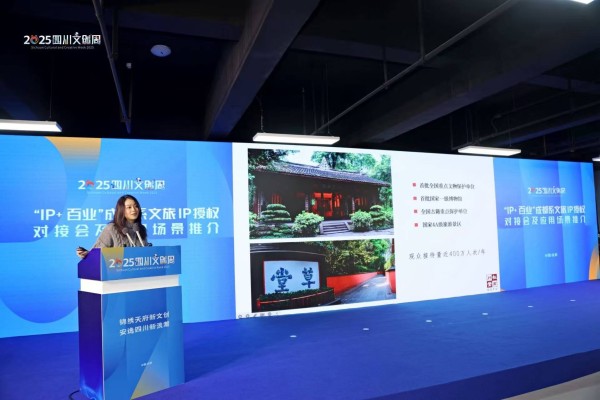 在路演环节中,各IP方展开推介:成都博物馆推动历史IP走进现代生活;成都金沙遗址博物馆以“太阳神鸟”链接古今创意;成都杜甫草堂博物馆将诗歌文化转化为可体验的IP内容;成都武侯祠博物馆挖掘三国文化的商业价值;国之瑰宝文化公司致力于熊猫文化的多样表达;成都文旅宽窄文创推动城市文旅IP化运营;四川极北文化发展有限公司以熊猫IP拓展跨界合作;一敞(成都)文化科技公司传递东方生活美学;四川漫光年文化科技有限公司则在文化遗产叙事中寻找当代共鸣。这些分享充分体现了成都文创IP的深厚底蕴与创新活力。
