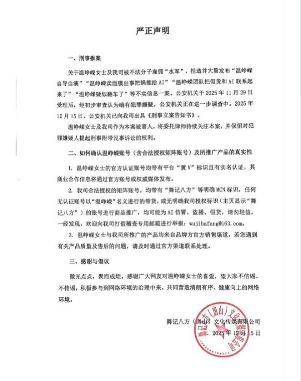 温峥嵘回应卖面膜争议,已报警刑事立案,公开警方立案告知书
