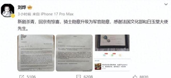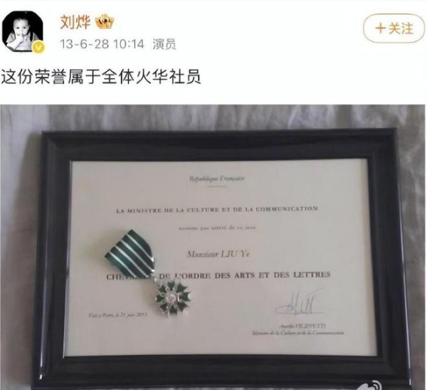 12月8号刘烨发了条微博,说新剧杀青回北京,还顺带晒了个大惊喜——法国艺术与文学军官勋章。照片里证书落款是法国驻华大使白玉堂,字里行间全是夸他“推动电影创作”“促进中法艺术交流”。