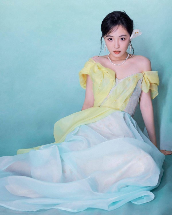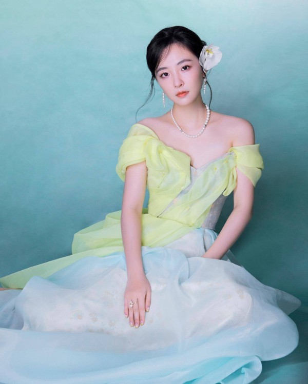 黄绿渐变的色彩,清新而柔和,给人一种温暖而又舒适的感觉。露肩的设计展现出她优美的肩部线条和精致的锁骨,增添了几分性感与妩媚。而裙摆的薄纱材质,轻盈灵动,随着她的步伐轻轻摇曳,仿佛是在诉说着一个浪漫的故事。