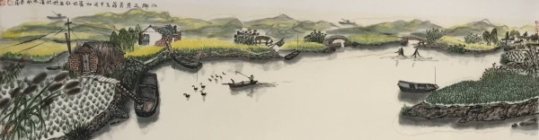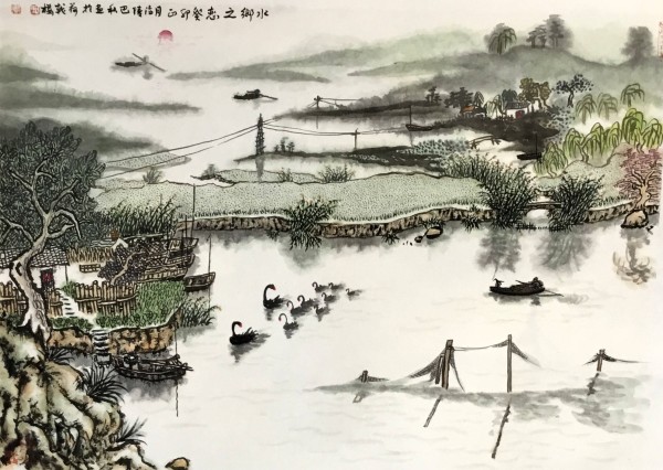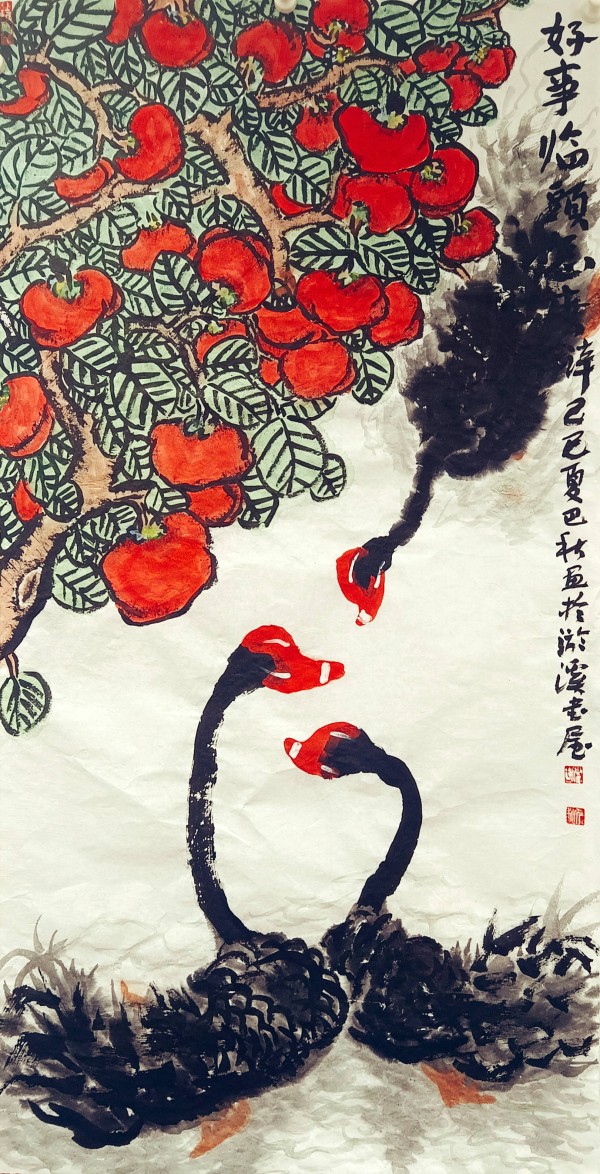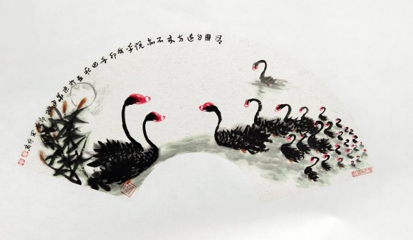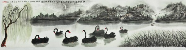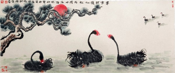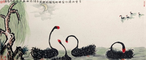 我主要是画山水的,兼画果蔬。画风兼工带写,画得很累。于是,我就想用笔墨画点轻松的、写意的东西。一次陪朋友去溱河湿地游览,见到河塘里游弋着的黑天鹅。一只只,一群群的,全身羽毛墨黑,红脑袋,白鼻子,生动活泼,煞是可爱。配上周围碧波荡漾,河畔绿树翠草,真是美得动人心魄。我倏地生出一个念头:我要画黑天鹅,而且要用写意的笔墨画,想必会产生意想不到的艺术效果。