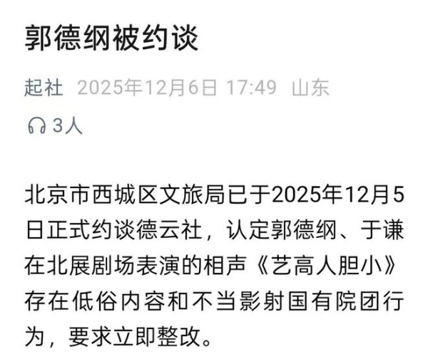 文章声称“北京市西城区文旅局已于2025年12月5日正式约谈德云社”,认定郭德纲、于谦在北展剧场表演的相声《艺高人胆小》存在低俗内容和不当影射国有院团行为。