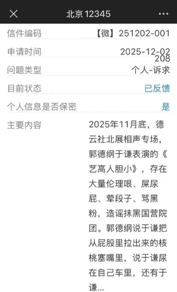 同时流传的还有两张截图:一张显示网友在12月2日向北京12345投诉这段相声“存在大量伦理哏、屎尿屁、荤段子、骂黑粉,造谣抹黑国营院团”;