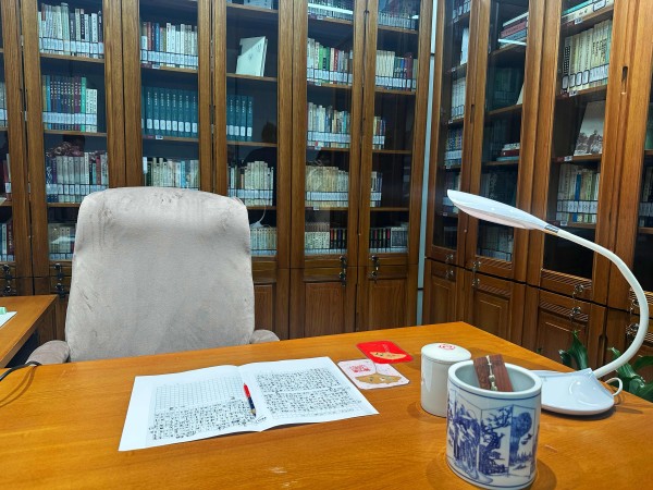 “两耳闻窗外事,一心读圣贤书”,步入“陈夏书房”,一副对联映入眼帘,进门处的玻璃展柜里陈列着陈平原、夏晓虹的手稿。60余平方米的空间典雅古朴、简洁实用,兼具学术质感与人文温度。